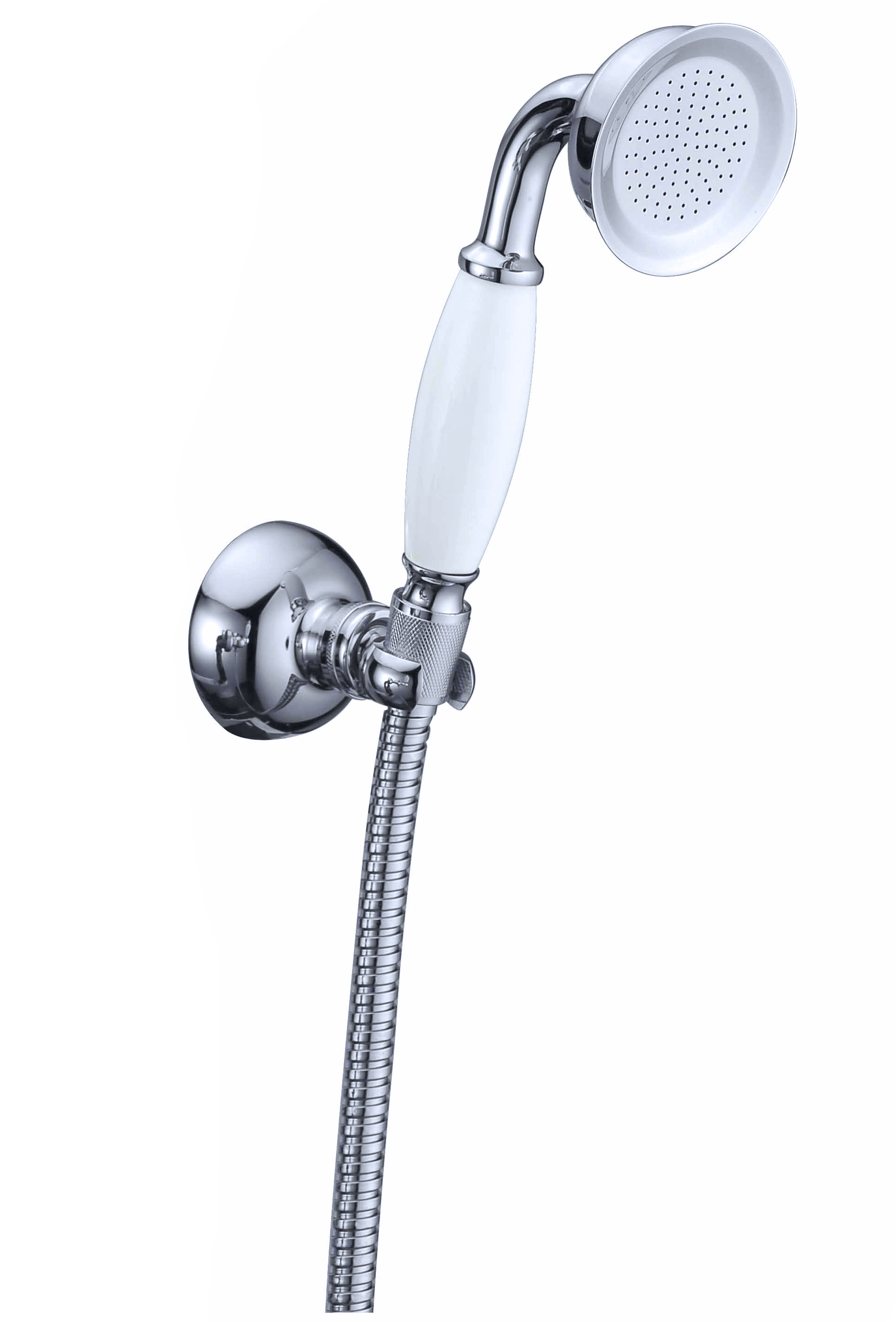 Комплектация: 1-режимная душевая лейка Ø50 мм, настенный держатель ручного душа, гибкий шланг длиной 1500 мм, соединение шланга 1/2 дюйма;