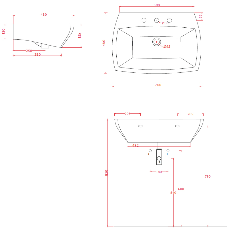 Размеры, (мм): длина - 700, ширина - 480, высота - 150;