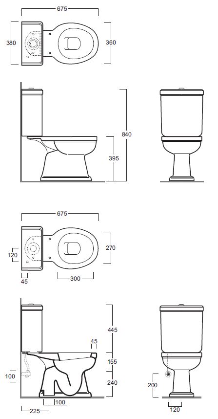 Размеры, (мм): ширина - 380, глубина - 675, высота с бачком - 840;