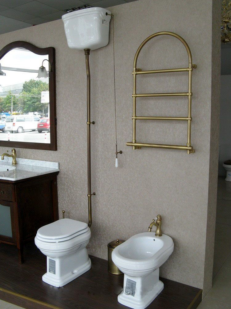 Комплектация: чаша унитаза, высокий бачок, механизм слива для высокого бачка с трубой и цепочкой в цвете золото, крепёж к полу;
