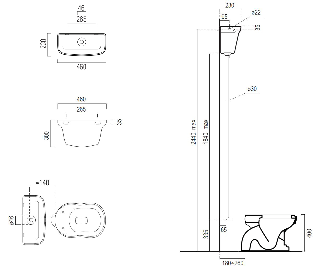 Размеры, (мм): ширина - 370, глубина - 580, высота унитаза - 400, высота бачка - 300, общая высота - 2440;