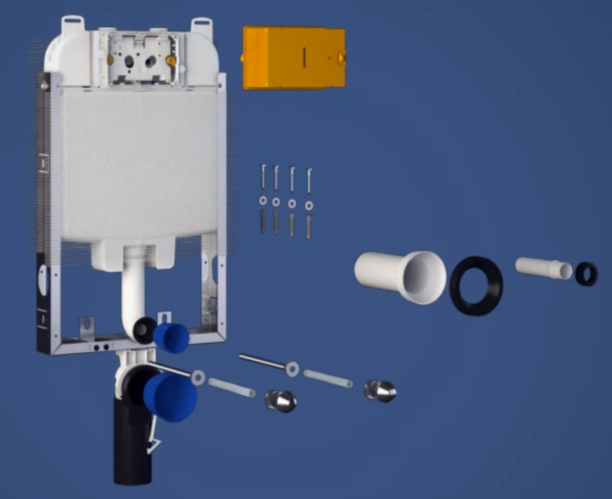 Комплектация: бачок, сетка для нанесения штукатурки, стальная рама с защитным покрытием, подключение к системе водоснабжения со встроенным запорным вентилем G 1/2, монтажная коробка для окна обслуживания, защитные заглушки, комплект соединительных патрубков для унитаза диаметром 90 мм, фановый отвод диаметром 90 мм, переходный патрубок диаметром 90/110 мм, 2 резьбовые шпильки, крепёжный набор;