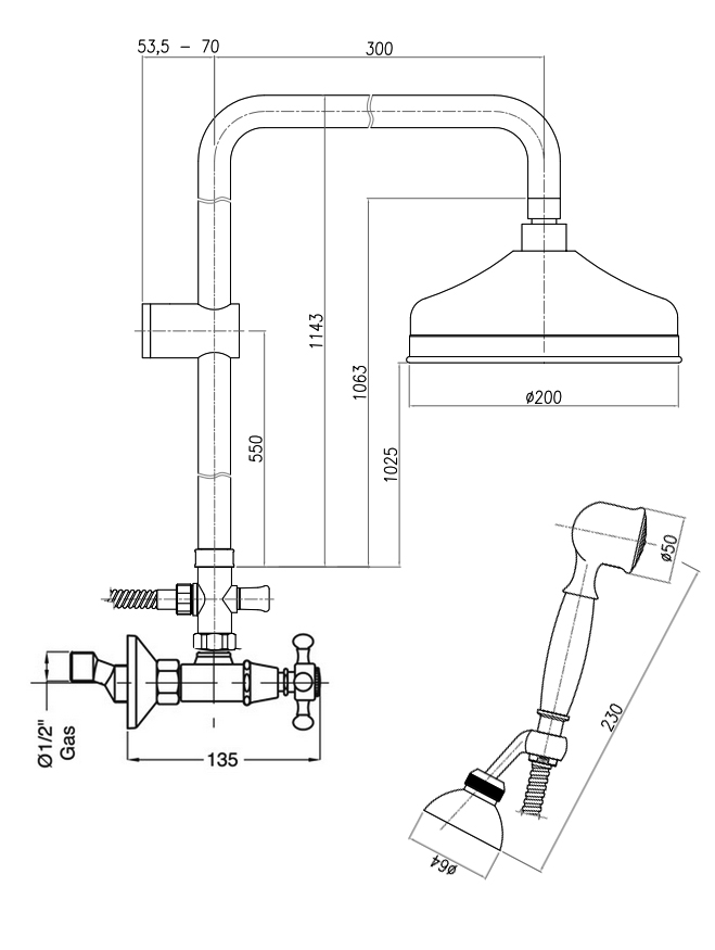 Комплектация: фиксированная неповоротная штанга, верхний тропический душ диаметром 200 мм, кронштейн верхнего душа с поворотным шарниром, стандартный смеситель для душа, 1-режимная душевая лейка диаметром 50 мм, настенный держатель душевой лейки, гибкий шланг длиной 1500 мм, подвод 1/2 дюйма;