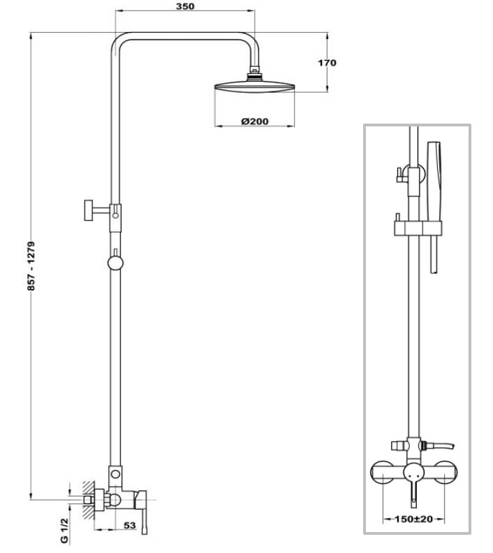 Размеры, (мм): высота - 857-1279, глубина (с тропическим душем) - 503;