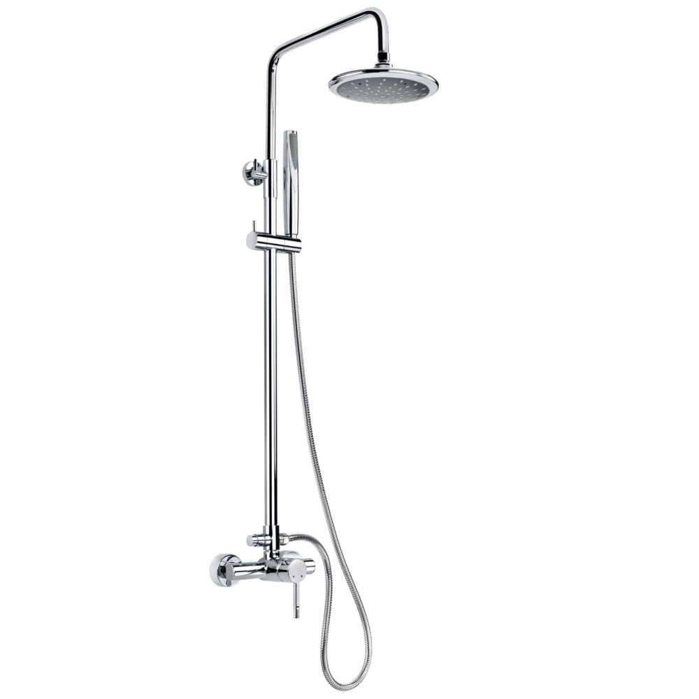 Комплектация: фиксированная неповоротная телескопическая штанга, верхний тропический душ диаметром 200 мм, кронштейн верхнего душа с поворотным шарниром, стандартный смеситель для душа, 1-режимная душевая лейка-стик, регулируемый по высоте держатель душевой лейки, гибкий металлический усиленный шланг длиной 1500 мм, соединение шланга 1/2 дюйма;