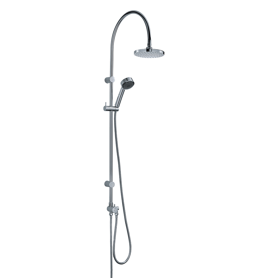 Комплектация: фиксированная неповоротная штанга длиной 1300 мм, верхний тропический душ диаметром 172 мм, кронштейн верхнего душа с поворотным шарниром, 1-режимная душевая лейка, регулируемый по высоте держатель ручного душа, переключатель (верхний/ручной душ), гибкий шланг длиной 1500 мм, соединение шланга 1/2 дюйма, шланг для подключения системы к смесителю длиной 800 мм;
