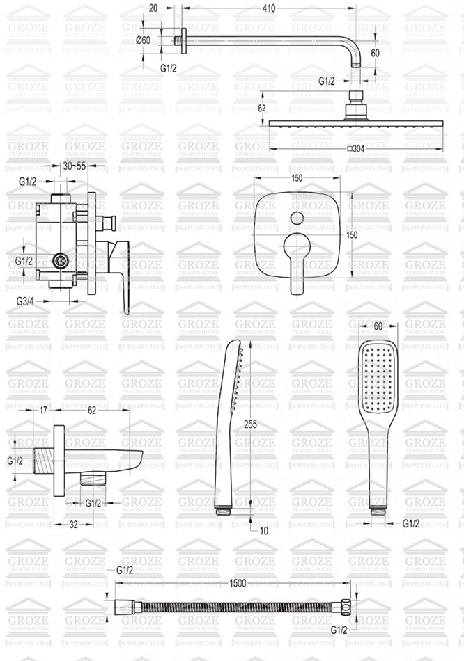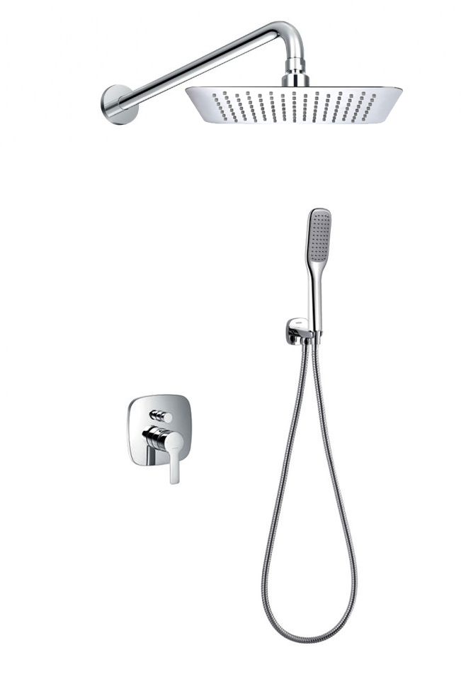 Комплектация: верхний квадратный тропический душ со стороной 300 мм, кронштейн верхнего душа с поворотным шарниром, настенный держатель-выпуск для душа, 1-режимная душевая лейка, гибкий шланг Isiflex (производство Германия) длиной 1500 мм, смеситель для душа с дивертором, встраиваемый блок Smart Box;