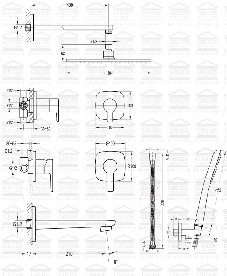 Комплектация: верхний квадратный тропический душ со стороной 300 мм, кронштейн верхнего душа с поворотным шарниром, настенный держатель-выпуск для душа, 1-режимная душевая лейка, гибкий шланг Isiflex (производство Германия) длиной 1500 мм, переключающий вентиль, монокомандный (однорычажный) смеситель скрытого монтажа, настенный излив на ванну длиной 210 мм, встраиваемый блок Smart Box;