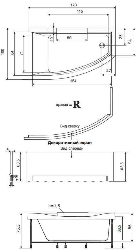 Комплектация: ванна, фронтальная панель, каркасная рама, слив-перелив;
