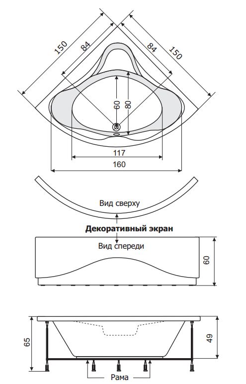 Комплектация: ванна, фронтальная панель, каркасная рама, слив-перелив;