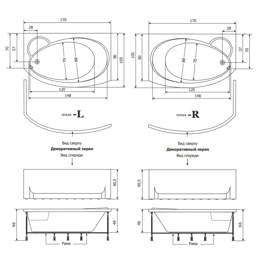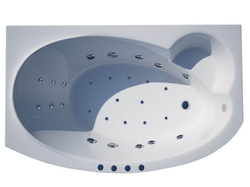 Комплектация: ванна, фронтальная панель, каркасная рама, слив-перелив, 6 встроенных гидромассажных форсунок, 6 встроенных mini форсунок (гидромассаж спины);