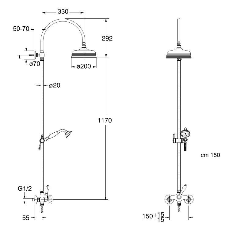 Комплектация: фиксированная неповоротная штанга, верхний тропический душ диаметром 200 мм, кронштейн верхнего душа с поворотным шарниром, двуручный смеситель для душа, 1-режимная душевая лейка, регулируемый по высоте держатель душевой лейки, гибкий шланг длиной 1500 мм;