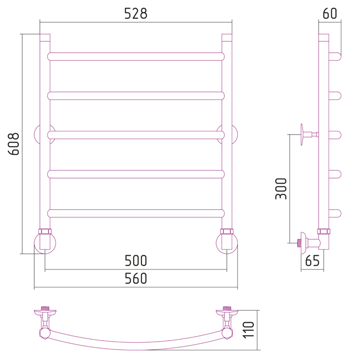 Комплектация: полотенцесушитель, кронштейны, запорные угловые вентили, декоративные чашечки-отражатели, эксцентрики, уплотнительные прокладки, крепёжный набор;