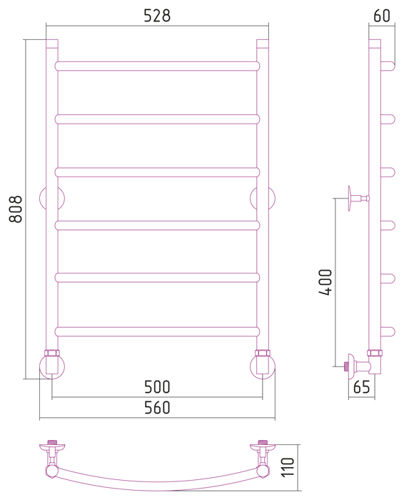 Комплектация: полотенцесушитель, кронштейны, запорные угловые вентили, декоративные чашечки-отражатели, эксцентрики, уплотнительные прокладки, крепёжный набор;