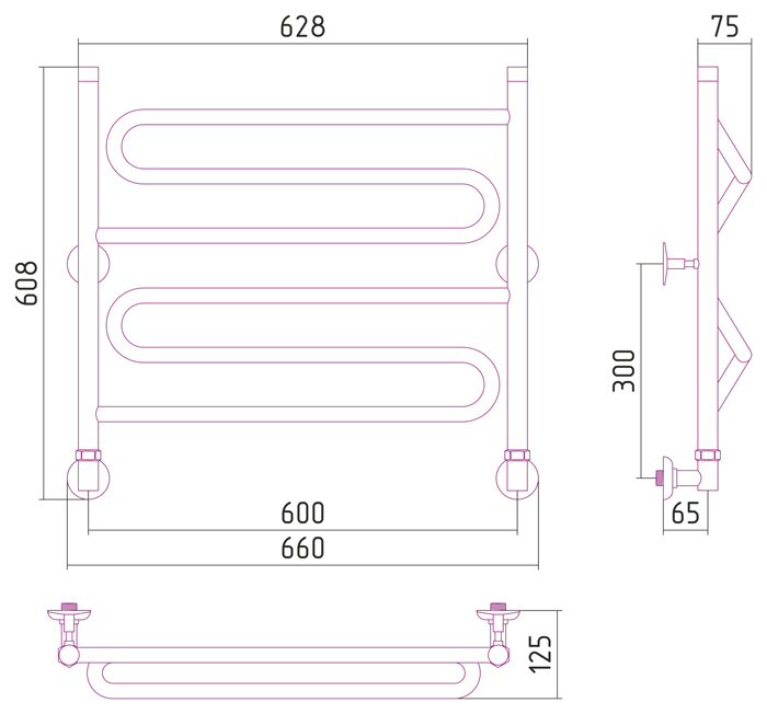 Комплектация: полотенцесушитель, кронштейны, запорные угловые вентили, декоративные чашечки-отражатели, эксцентрики, уплотнительные прокладки, крепёжный набор;
