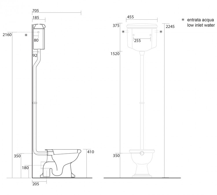 Размеры, (мм): ширина - 455, глубина - 705, высота унитаза - 410, высота бачка с крышкой - 375, общая высота- 2245;