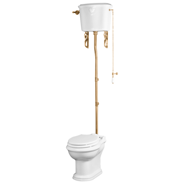 Комплектация: чаша унитаза, высокий бачок, механизм слива для высокого бачка с трубой и цепочкой в цвете золото, крепёж к полу;