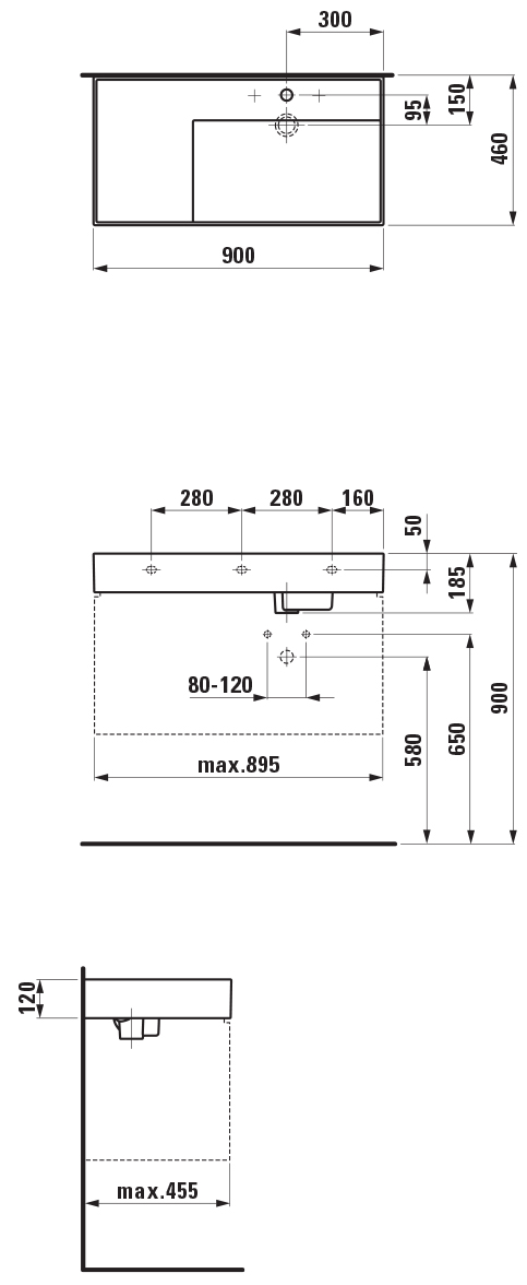 Размеры, (мм): длина - 900, ширина - 460, высота - 185, глубина - 120;