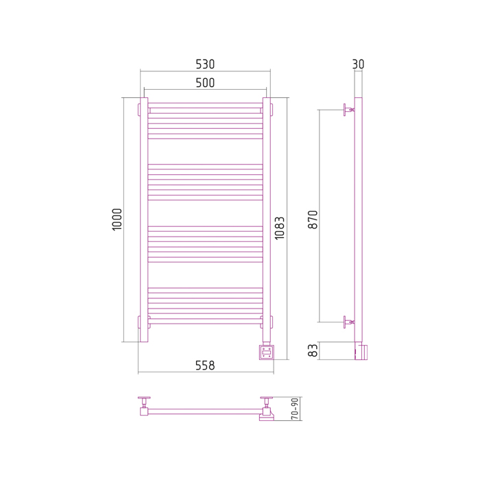 Размеры, (мм): высота - 1083, ширина - 558, глубина - 70-90;