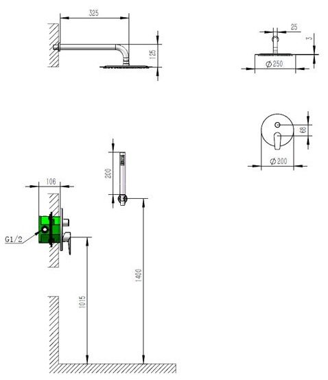 Комплектация: верхний тропический душ диаметр 250мм, кронштейн настенный
