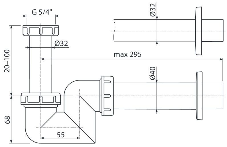 Компактный сифон Sanit (Германия) с накидной гайкой G 5/4 дюйма для подключения слива раковины;