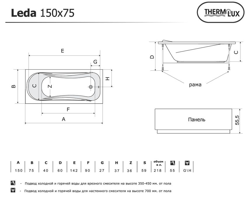 Размеры: длина - 150 см, ширина - 75 см, глубина - 40 см;