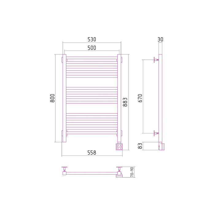 Размеры, (мм): высота - 883, ширина - 560, глубина - 70-90;