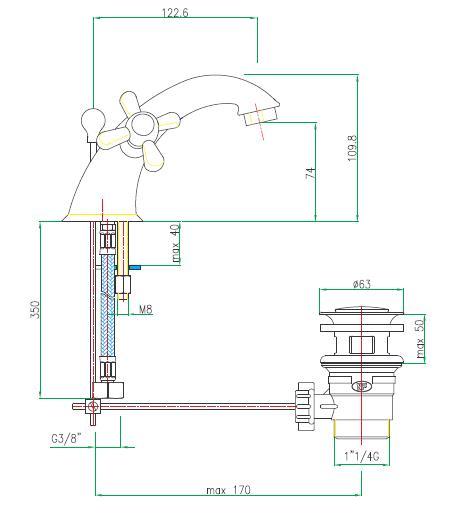 Комплектация: смеситель, гибкая подводка, донный клапан;