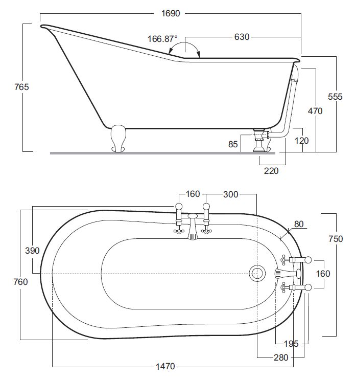 Размеры, (мм): длина - 1690, ширина - 760, общая высота - 765, высота от пола до дна ванны - 120, глубина - 435;