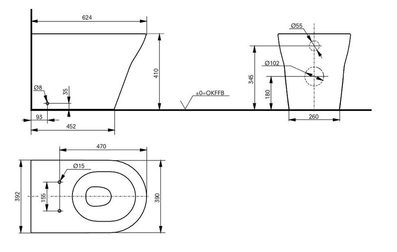 Размеры (мм): глубина (т.е.насколько выдается от стены) - 624, ширина - 390, высота чаши унитаза - 410;
