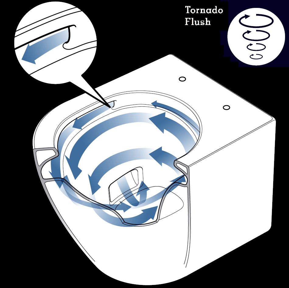 Смыв: 3-х струйный, вертикальный круговой с системой Tornado Flush (бесшумный эффект);