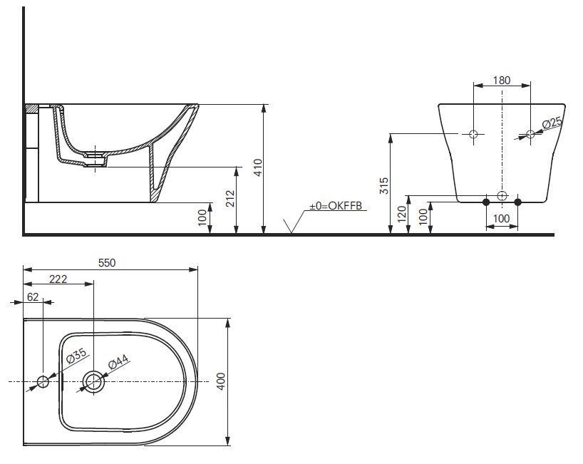 Размеры (мм): глубина (т.е.насколько выдается от стены) - 550, ширина - 400, высота чаши биде - 310, высота над уровнем пола - 410, расстояние от пола до нижней части биде - 100;