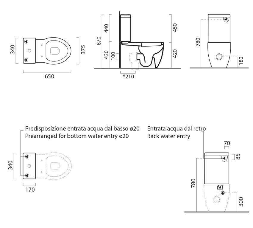Размеры, (мм): ширина - 375, глубина - 650, высота с бачком - 870;