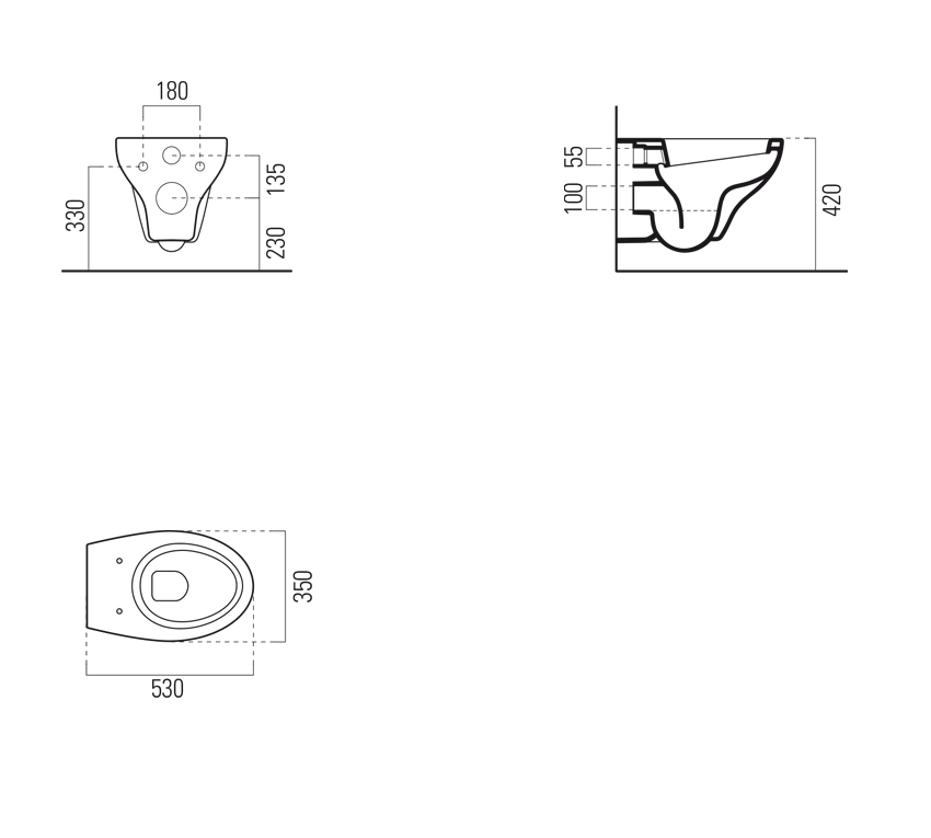 Размеры, (мм): ширина - 350, глубина - 530, высота унитаза от пола - 420, высота от пола до сливного колена унитаза - 104;