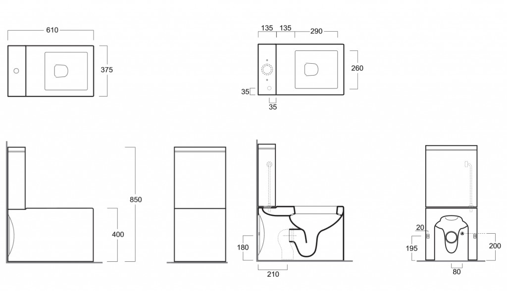 Размеры, (мм): ширина - 375, глубина - 610, высота с бачком - 850;