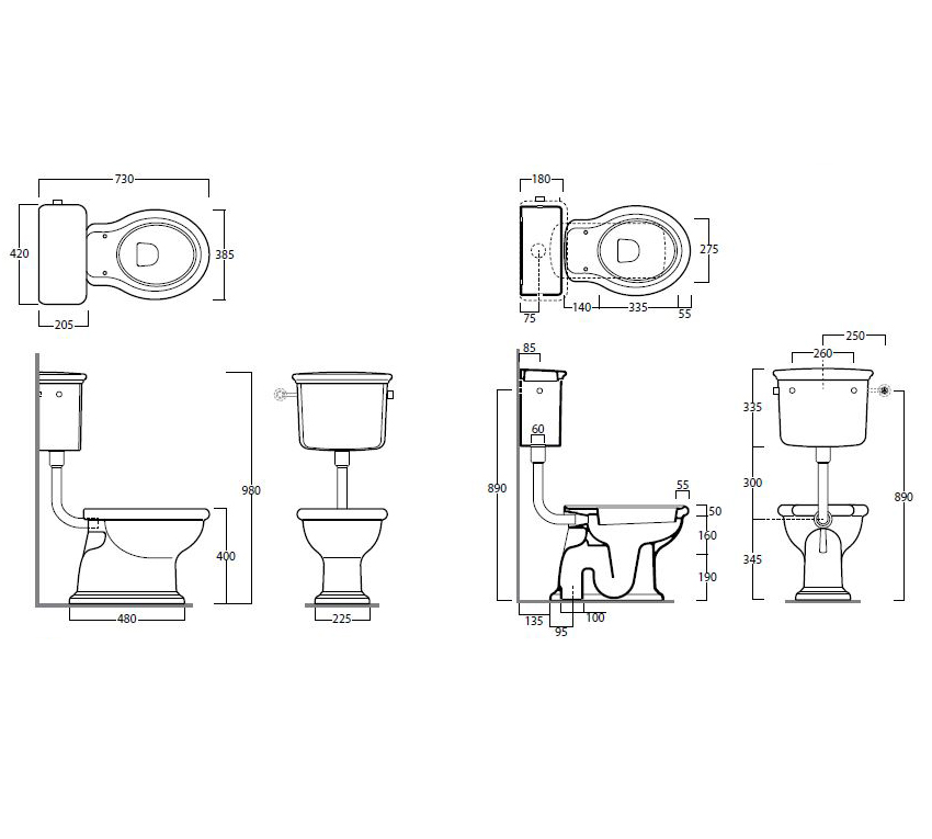 Размеры, (мм): ширина унитаза - 385, ширина бачка - 420, глубина - 730, высота унитаза - 400, высота бачка - 335, общая высота - 980;