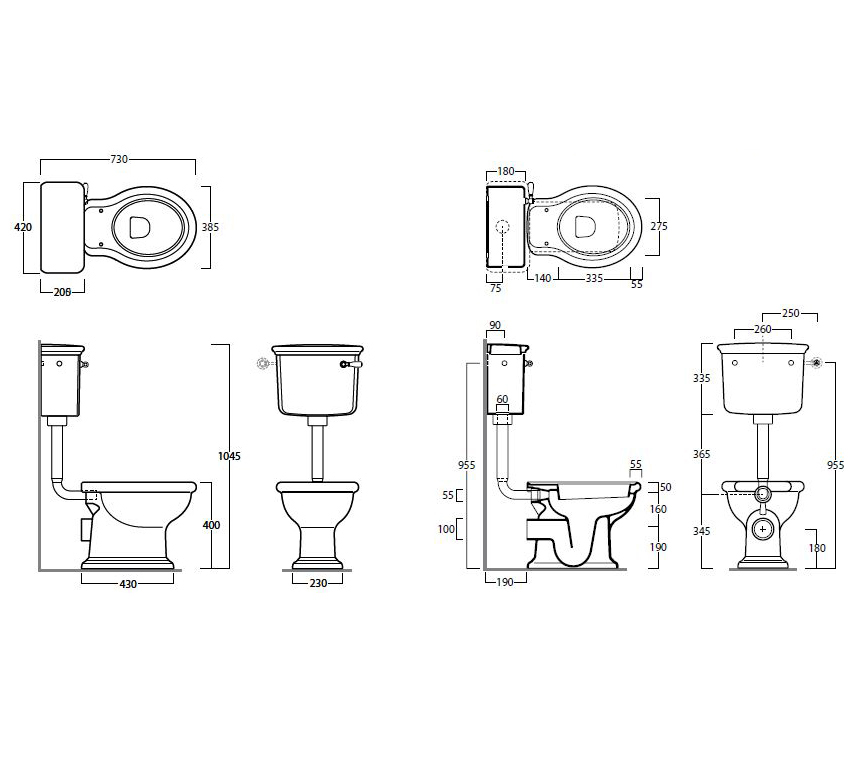 Размеры, (мм): ширина унитаза - 385, ширина бачка - 420, глубина - 730, высота унитаза - 400, высота бачка - 335, общая высота - 1045;