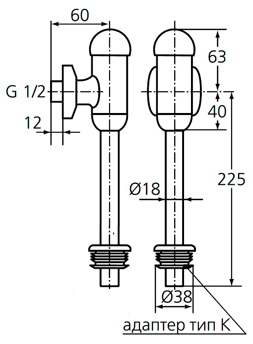 Нажимной кран Ideal Standard для уринала без регулировки, для верхней подводки, с резиновым адаптором и розеткой.
