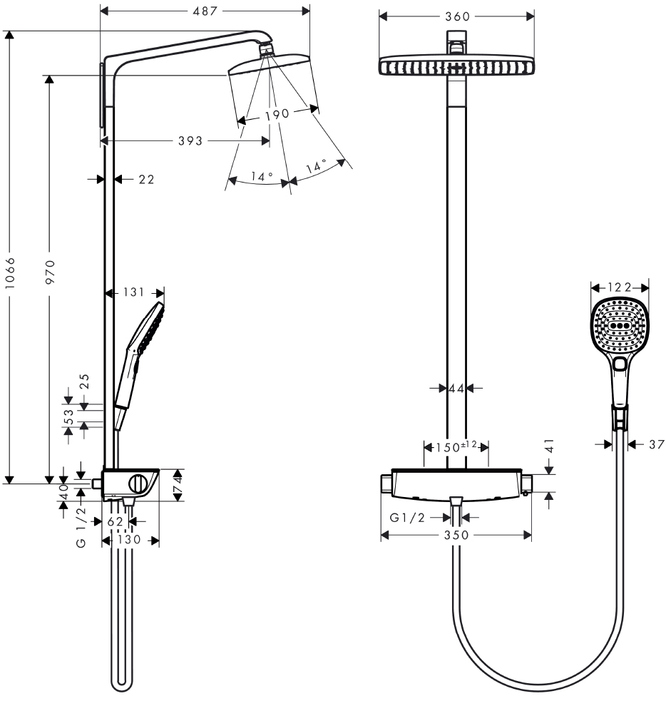 Комплектация: фиксированная неповоротная штанга, верхний тропический душ 360х190 мм, кронштейн верхнего душа с поворотным шарниром, термостатический смеситель для душа, 3-режимная душевая лейка 120х120 мм, настенный держатель душевой лейки, гибкий шланг ISIFLEX длиной 1600 мм, соединение шланга 1/2 дюйма, компенсатор толщины плитки;