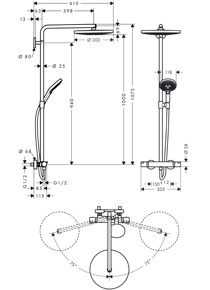 Комплектация: фиксированная поворотная штанга 150°, верхний тропический душ 300 мм, термостатический смеситель для душа, 3-режимная душевая лейка 120 мм, регулируемый по высоте держатель душевой лейки, гибкий шланг ISIFLEX длиной 1600 мм, соединение шланга 1/2 дюйма, выравнивающий набор;