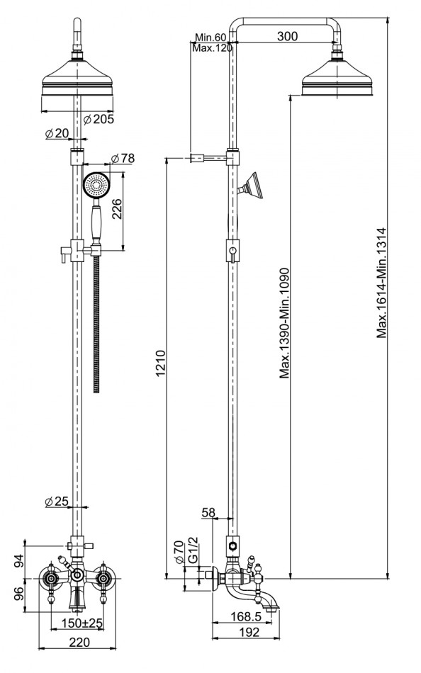 Размеры, (мм): высота - 1314-1614, ширина - 220, глубина (с тропическим душем) - 460-520;