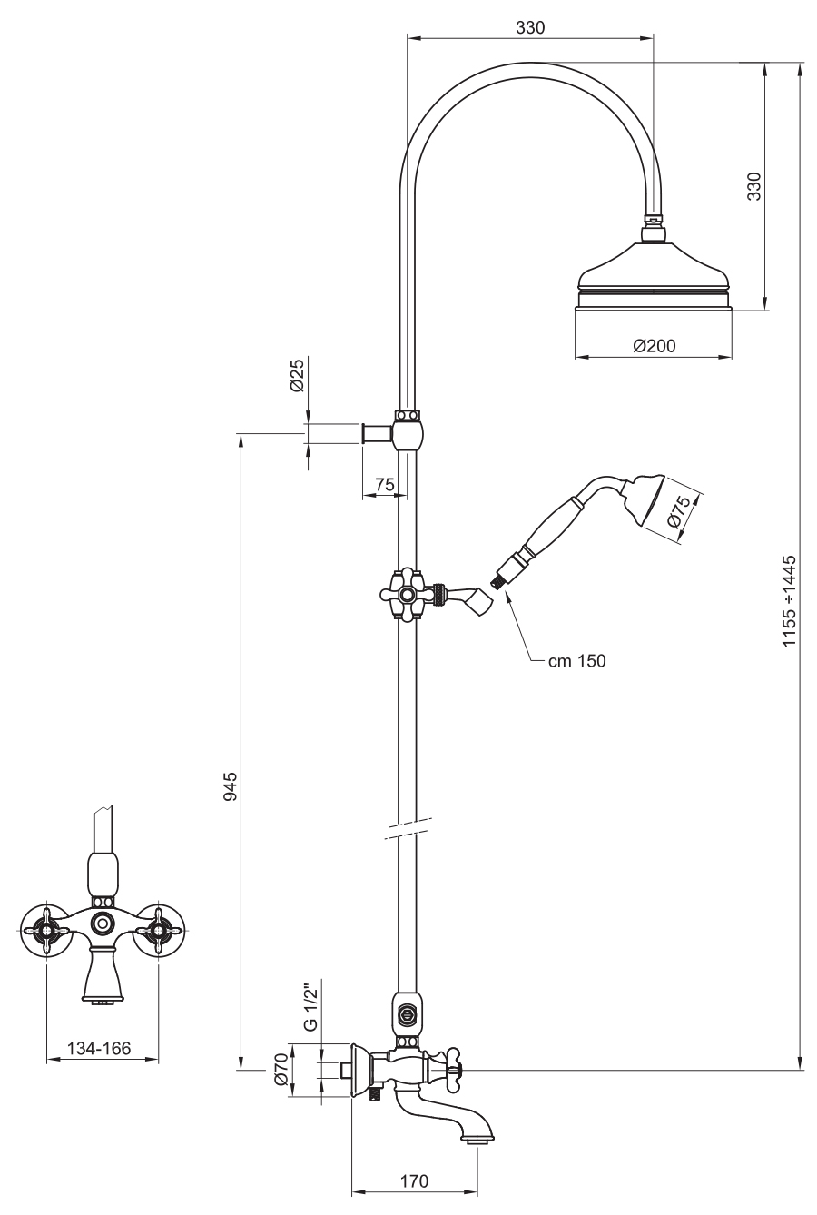 Технические размеры: соединительная резьба G 1/2, межосевое подключение 134-166 мм;
