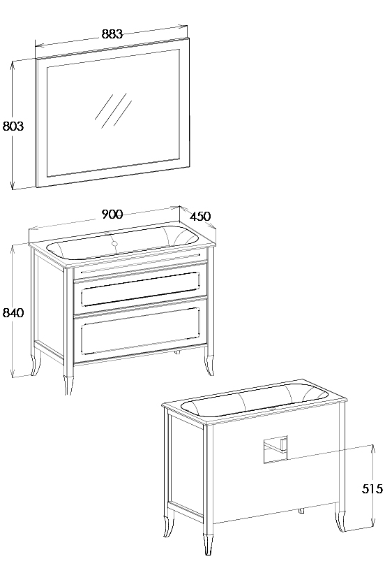 Размеры, (мм): зеркало: ширина - 883, высота - 803, глубина - 22, тумба: ширина - 900, высота - 840, глубина - 450;