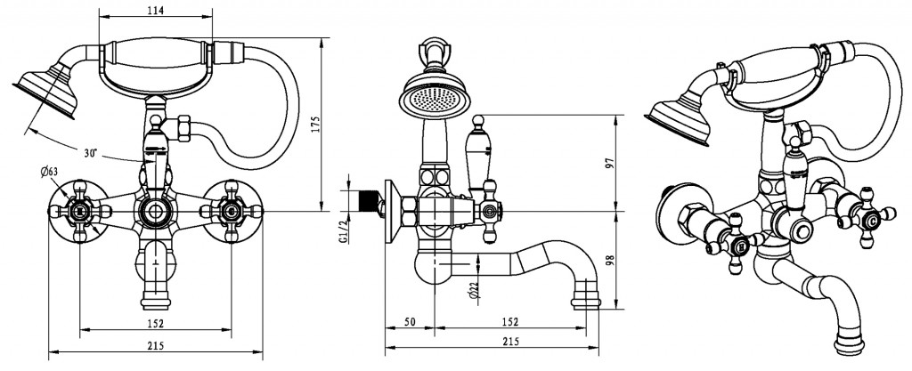 Комплектация: смеситель для ванны и душа (есть излив на ванну) с держателем душевой лейки, 1-режимная душевая лейка, комплект крепления, гибкая подводка, гибкий металлический шланг, дивертор;