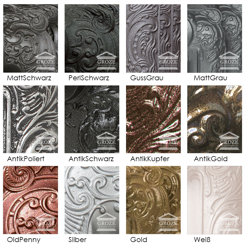 Доступные цветовые решения: AntikGold (античное золото), AntikKupfer (античная медь), AntikSchwarz (античный чёрный), GussGrau (серый чугун), MattGrau (серый матовый), MattSchwarz (чёрный матовый), OldPenny ("старый пенни"), PerlSchwarz (перламутровый чёрный), RAL 9016 Glanz (белый глянцевый), RAL 9016 Matt (белый матовый);