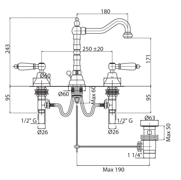 Комплектация: смеситель, гибкая подводка, донный клапан;