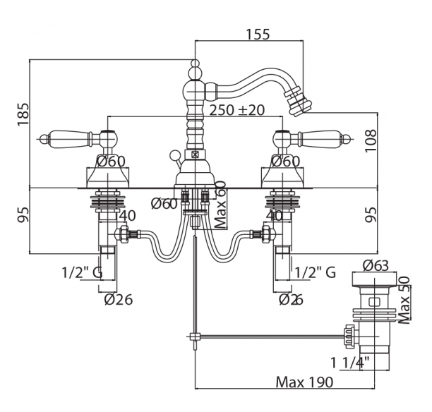 Размеры, (мм): высота - 185, длина излива - 155;