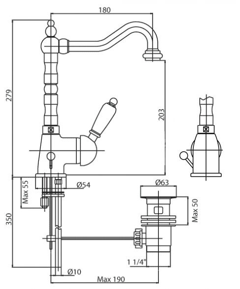 Размеры, (мм): высота - 279, длина излива - 180;
