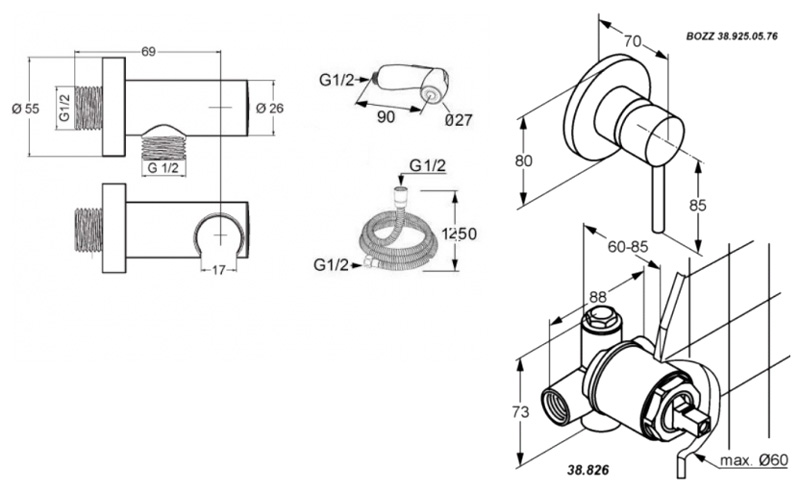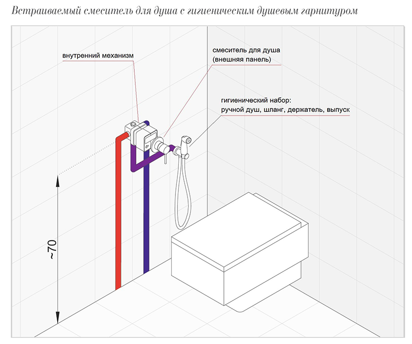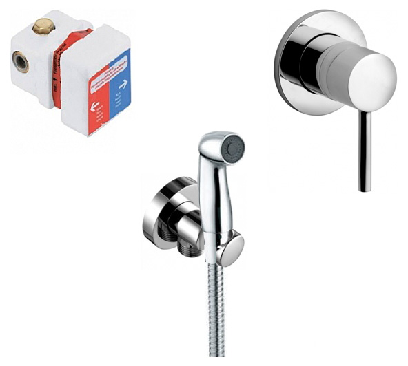 Комплектация: смеситель скрытого монтажа (внутренний механизм, внешняя панель), гигиенический душ, шланг длиной 1250 мм, настенный держатель, выпуск;
