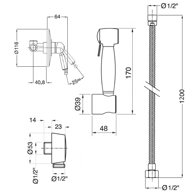 Комплектация: смеситель скрытого монтажа (внутренний механизм, внешняя панель), гигиенический душ, шланг длиной 1200 мм, настенный держатель, выпуск;